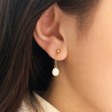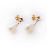- Natural cultured white pearl dangle earrings in solid 14k yellow gold. Each earring size: 24.3mm(L) x 7mm(H) x 6mm(W)
