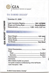 [Clearance] GIA Certified Round Loose Diamond, 0.31 Carat, E Colour, IF, H&A, Year 2005